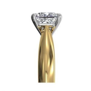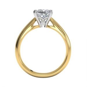 Anillo de compromiso en oro amarillo o blanco de 18 quilates, con un agarre delicado y una piedra central de corte princesa, solicítalo con un Diamante corte redondo.
